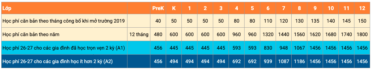 (b) Các gia đình đóng học phí cả năm được giảm 5%, áp dụng tới hết ngày 31/8/2026. Các gia đình cũng có thể chọn đóng học phí 6 tháng. Các gia đình khó khăn có thể email yêu cầu đóng học phí mỗi 3 tháng.