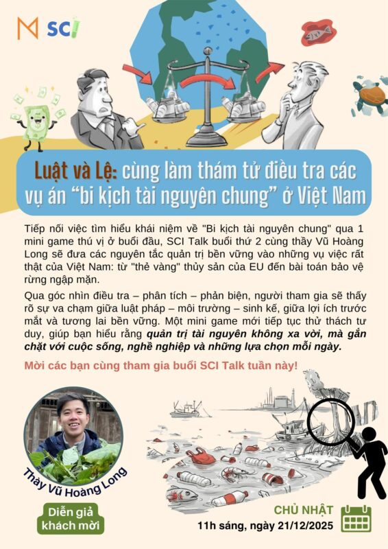 Tiếp nối việc tìm hiểu khái niệm về “Bi kịch tài nguyên chung” qua một mini game thú vị ở buổi đầu, trong buổi SCI Talk tuần này, chúng ta sẽ cùng thày Vũ Hoàng Long “lật lại hồ sơ” của những vụ án rất thật của Việt Nam.