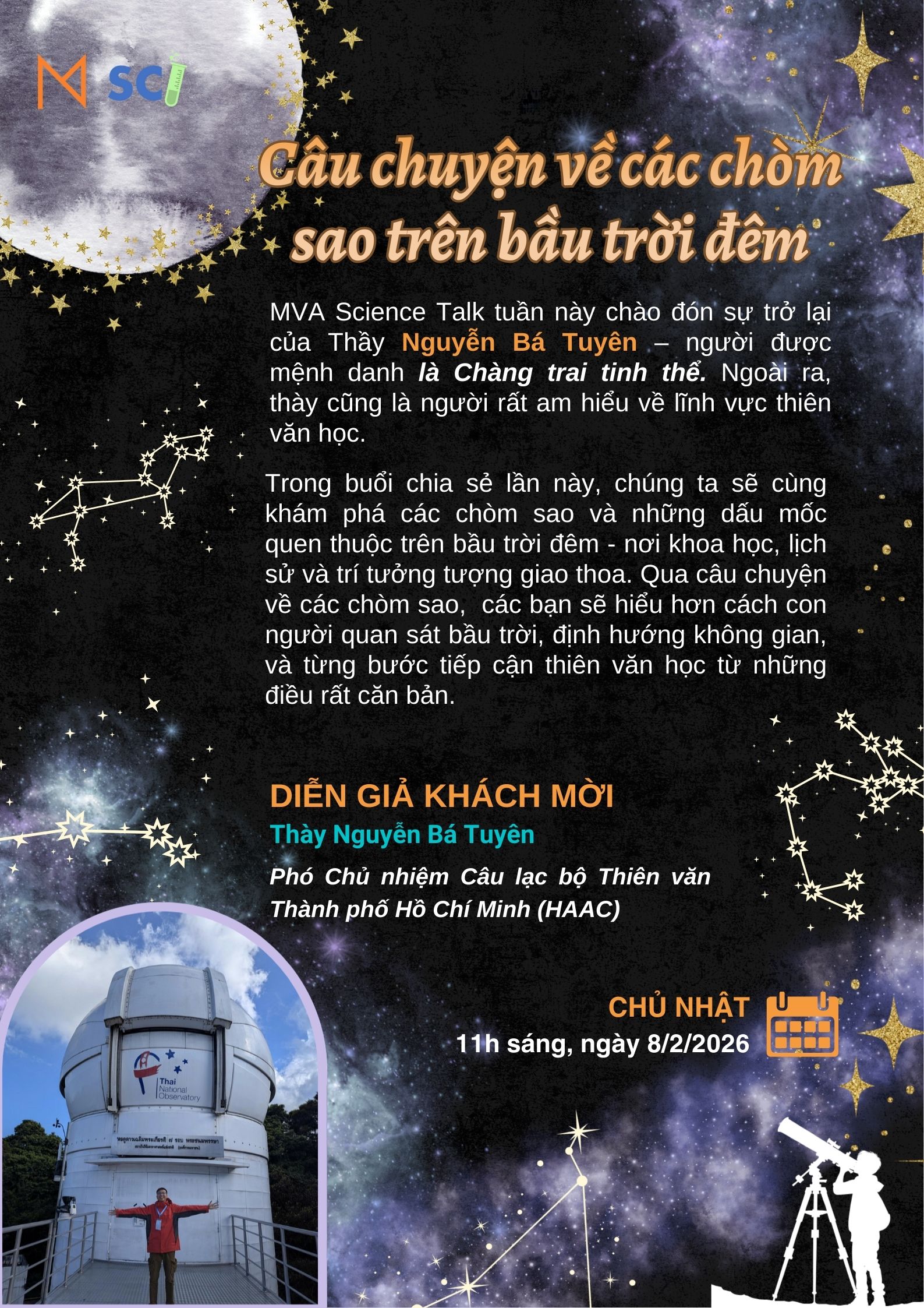 Với nhiều năm gắn bó cùng các hoạt động quan sát bầu trời, dẫn dắt các buổi quan sát cộng đồng và làm việc trực tiếp với học sinh, sinh viên. Thầy Tuyên đến với các bạn nhỏ không chỉ dưới góc nhìn khoa học, mà còn rất gần gũi và truyền cảm hứng từ cuộc sống hàng ngày. Trong buổi chia sẻ lần này, Thầy sẽ cùng chúng ta khám phá các chòm sao và các “dấu mốc” quen thuộc trên bầu trời đêm, nơi khoa học, lịch sử và trí tưởng tượng của con người giao thoa. Qua câu chuyện về các chòm sao, các bạn sẽ hiểu hơn cách con người quan sát bầu trời, định hướng không gian, và từng bước tiếp cận thiên văn học từ những điều rất căn bản.